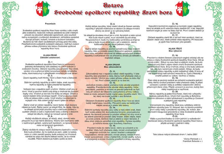 Svobodná spolková republika Kraví hora je svrchovaný, jednotný demokratický stát založený na úctě k právům a svobodám člověka. Občané republiky jsou pěstitelé révy vinné, výrobci vína a příznivci lehké konzumace tohoto lahodného moku, které konzumují v přiměřeném množství pro své zdraví .